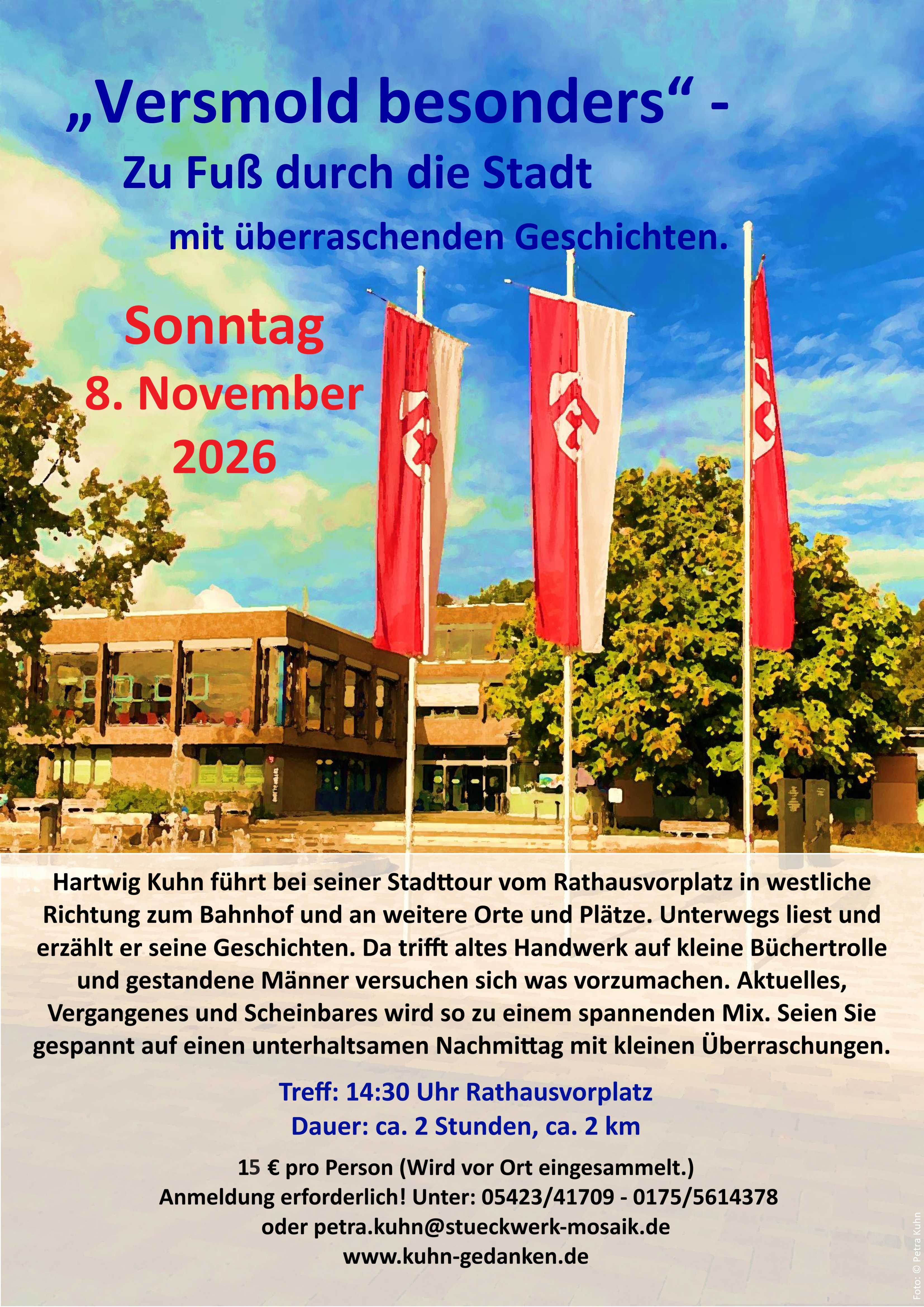 | "Versmold besonders" 2026 Zu Fuß durch die Stadt Eine Stadttour der besonderen Art: Sonntag, den 08. November 2026 um 14:30 Uhr Gern schon einmal vormerken! Eine Anmeldung ist erforderlich!!! 05423/41709 oder 0175/5614378 oder petra.kuhn@stueckwerk-mosaik.de |