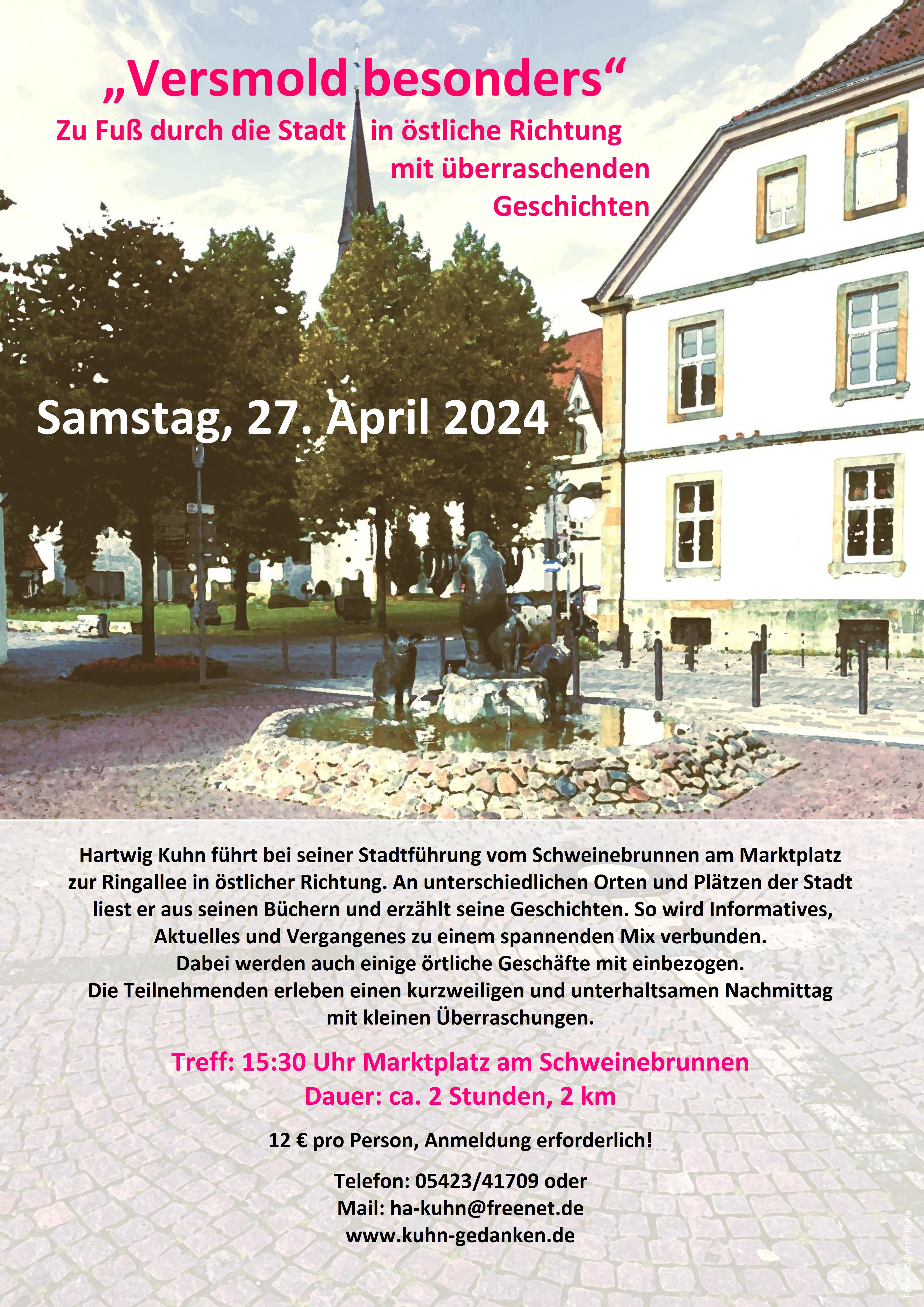 | „Versmold besonders“ 2026 Zu Fuß durch die Stadt Eine Stadtführung der besonderen Art: Sonntag, den 26. April 2026 um 15:30 Uhr Gern schon einmal vormerken! Eine Anmeldung ist erforderlich!!! 05423/41709 oder 0175/5614378 oder petra.kuhn@stueckwerk-mosaik.de |
