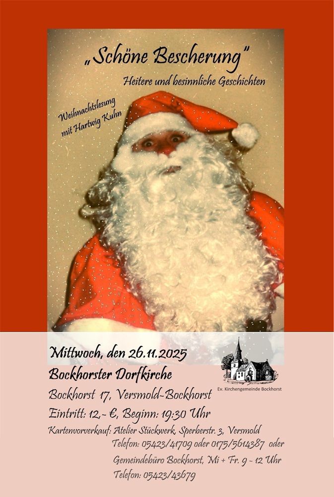 "Schöne Bescherung" - Heitere und besinnliche Weihnachts- und Familiengeschichten Mittwoch 26.11.2025 Beginn: 19:30 Uhr (Einlass: 19:00 Uhr) Eintritt: 12,- Euro Bockhorster Dorfkirche Bockhorst 17, Versmold, OT Bockhorst Ev.-Luth. Kirchengemeinde Bockhorst |