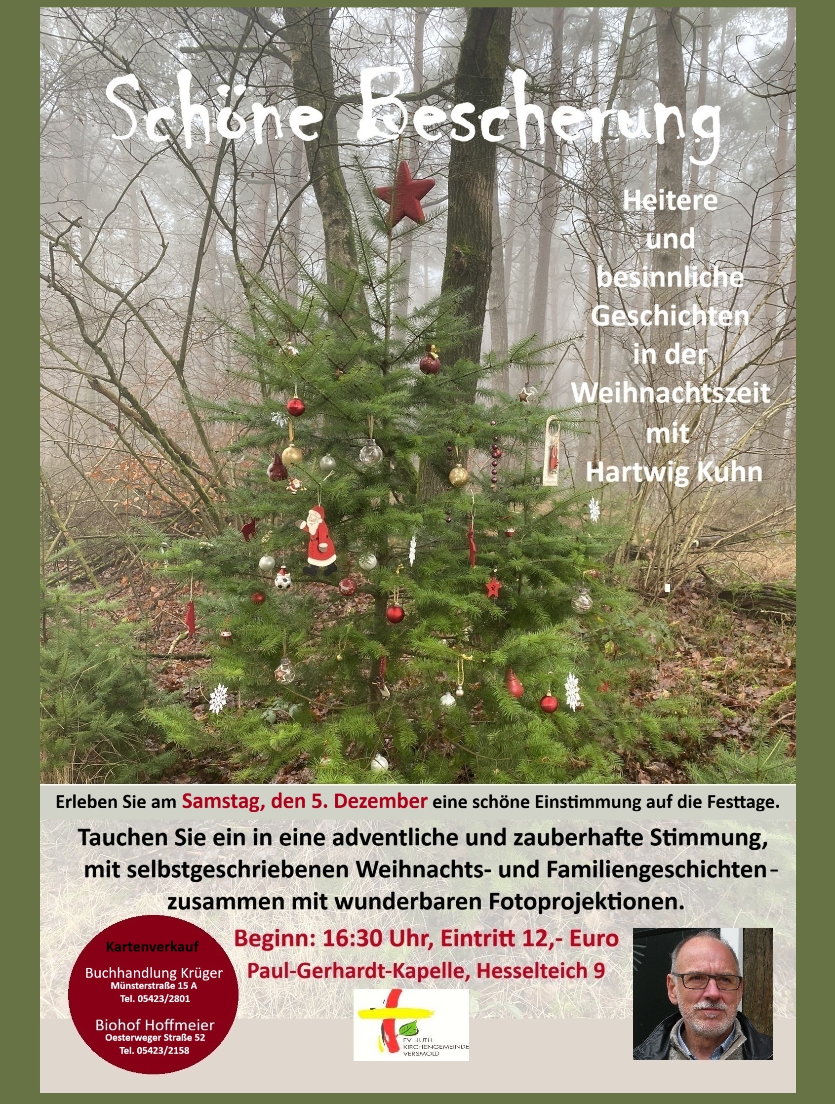 Bescherung" 2026 Heitere und besinnliche Geschichten in der Weihnachtszeit Samstag, den 5. Dezember 2026 Einlass: 16:00 Uhr, Beginn: 16:30 Uhr Eintritt: 12,- Euro Der Kartenvorverkauf startet am 2. November! Paul-Gerhardt-Kapelle Hesselteich 9, Versmold-Hesselteich |